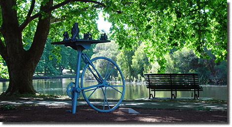An iconic character rides his bike to Hyde Park daily, with his cockatoo and chessboard. The figures on the chessboard represent the locals and their activities in the park. The breif required a small artwork accessible to children and those in wheelchairs.