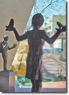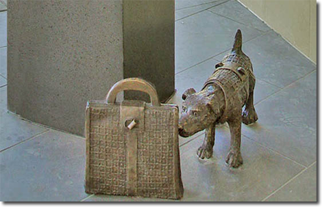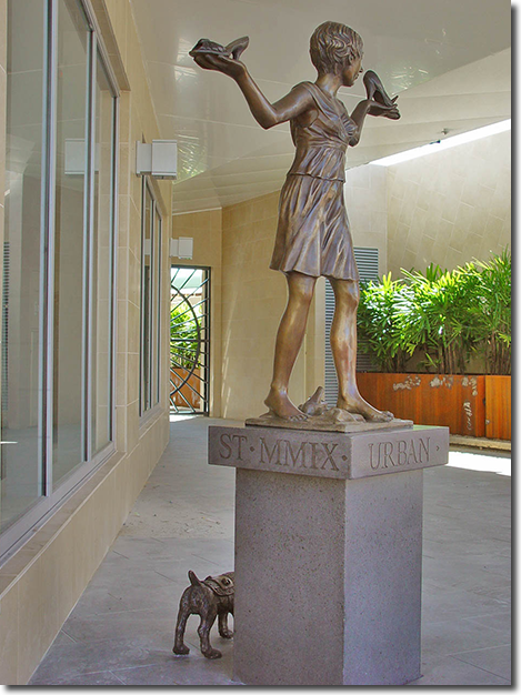 These sculptures sit either side of the entrance to the building. Subiaco is a shopping area popular with design conscious locals. The town takes its name from Subiaco in Rome and these works make a tongue in cheek reference to the Greco/Roman sculptures.
