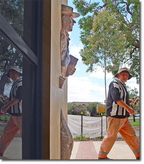 "Borrowing Ideas": This sculpture is located on the external surface of the library wall. The figure breaks through the wall surface carrying a copy of "The Time Machine by HG Wells" he illustrates the power of books to extend our imagination.