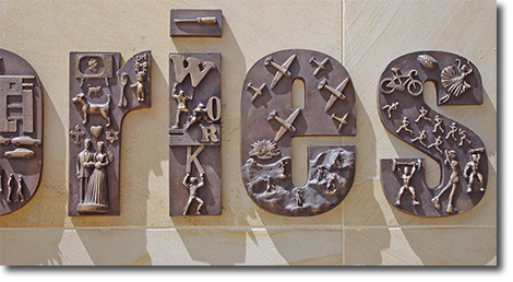 "Our Stories": The word stories is located on the external wall of the local history section of the library. Each letter is covered with small scenes from the lives of residents.